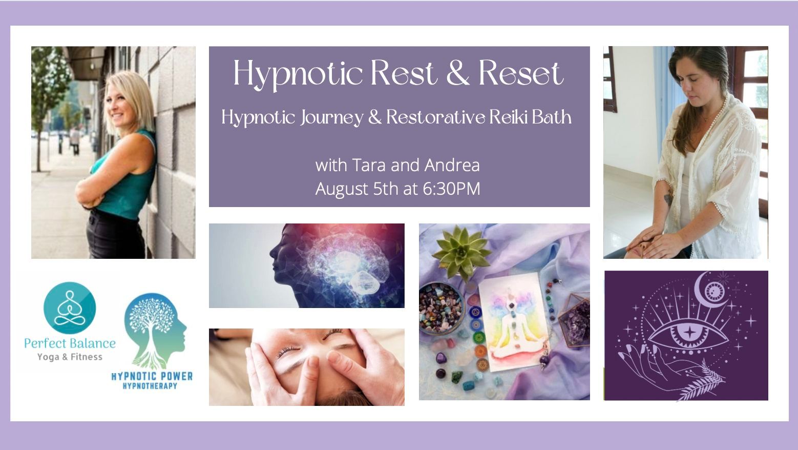 Arrive at Perfect Balance for an evening of Restorative Yoga, Group Guided Hypnosis Journey and Reiki Bath! Together, we’ll cultivate connection with body, breath and mind, creating space for calm, clarity and deep peace. Restorative Yoga is a practice designed to help release deeply held tension, providing a safe container for letting go. Andrea will guide you into a state of relaxation through Restorative Yoga practice to delve deeper into nurturing compassionate self-awareness. Poses will be held for several minutes with the complete support of pillows, blankets, and props enabling conscious relaxation in both body and mind. After we allow ourselves to arrive and slow down, Tara will guide us through a group hypnosis to cultivate for compassion and understanding for self. Hypnotherapy is like a massage for your body and your brain you’ll feel relaxed and calm and when you come out of a session you’ll feel lighter and at ease. Throughout the practice, you will receive distance and hand on Reiki from Andrea. Reiki is a noninvasive, gentle healing modality that works to dissolve tension from the body, mind, and spirit. Reiki energy is transferred into your body to help bring you back to your balance. Helping to release emotions, thought forms, and heal old wounds.